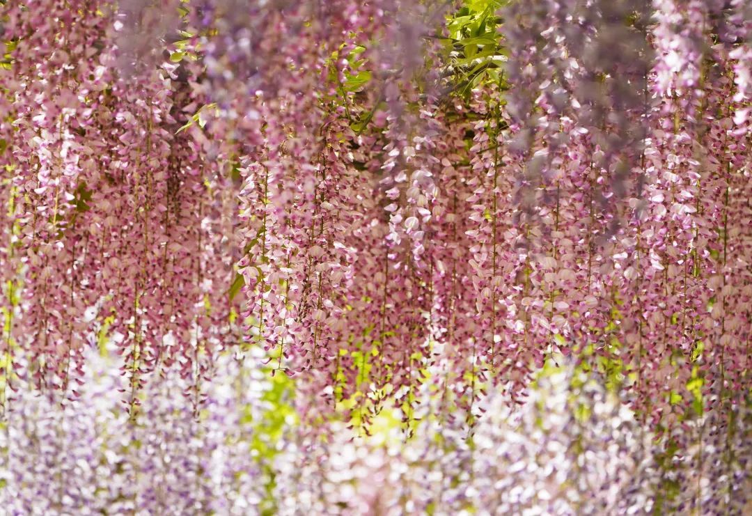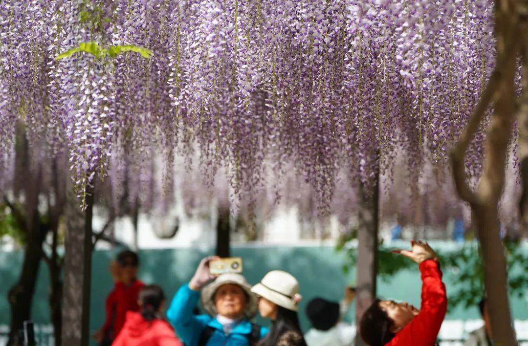 融融春日,紫藤花开,宛如挂满一串串紫色风铃,灵动飘逸,成为万紫千红中的别样景致。紫藤花又名藤萝、朱藤等,象征紫气东来,吉祥如意,颇受人们的喜爱。目前,玉渊潭公园内200余株以熊野、开东阁、阿知、久伊豆等为代表品种的多花紫藤已是花开如瀑,如梦似幻。站在藤架下,长长的花絮珠帘叠翠,偶有微风拂过,沁人的香气便开始蔓延开来。近年来,公园为满足广大市民游客春季接续赏花需求,精心挑选引种了多花紫藤填补园内立体绿化景观中的空白,主要分布在公园樱花园科普广场、玉渊春秋等景区供游客观赏。