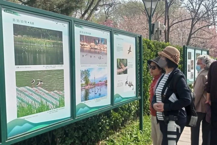 东湖北岸的“季候有常 万物和生”及“保护湿地 共享生态”两大科普展览,分别以二十四节气物候和湿地知识为主题,通过图文并茂的形式展示了自立春至大暑时节,公园内花、鸟、昆虫等动植物自然变化、物种知识以及丰富的湿地知识,呼吁大家爱护湿地、身体力行参与湿地保护行动当中,共创生态文明和谐的游园环境。