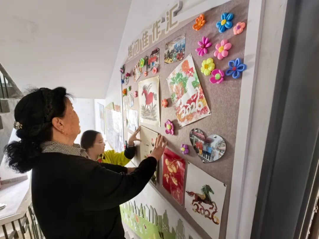 邻居们坐在一起商量,最后定下了“银发”携“童心”的楼门主题。张淑敏和社区工作人员共同牵头分工:楼里的老人负责清洁展板,孩子们则围绕“邻里互助、敬老爱老”创作艺术作品。一匹匹骏马疾风图、一件件非遗纸浆作品、一朵朵彩泥手工艺品……老少两代人亲手完成的作品挂满了楼道墙壁。这面“邻里和睦图”成了水屯家园楼门最美的风景,也成为文明城区创建与楼门治理融合的生动样板。