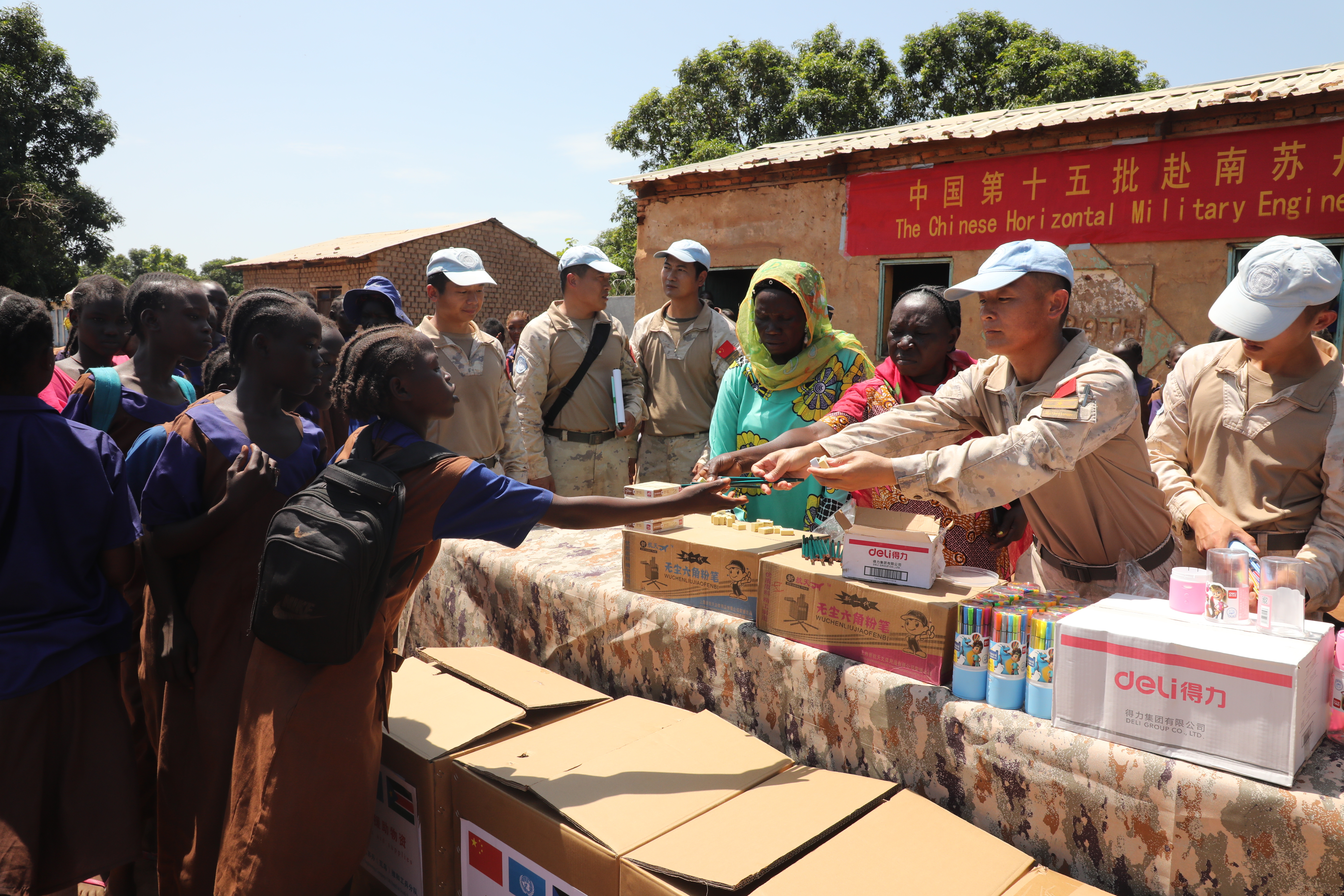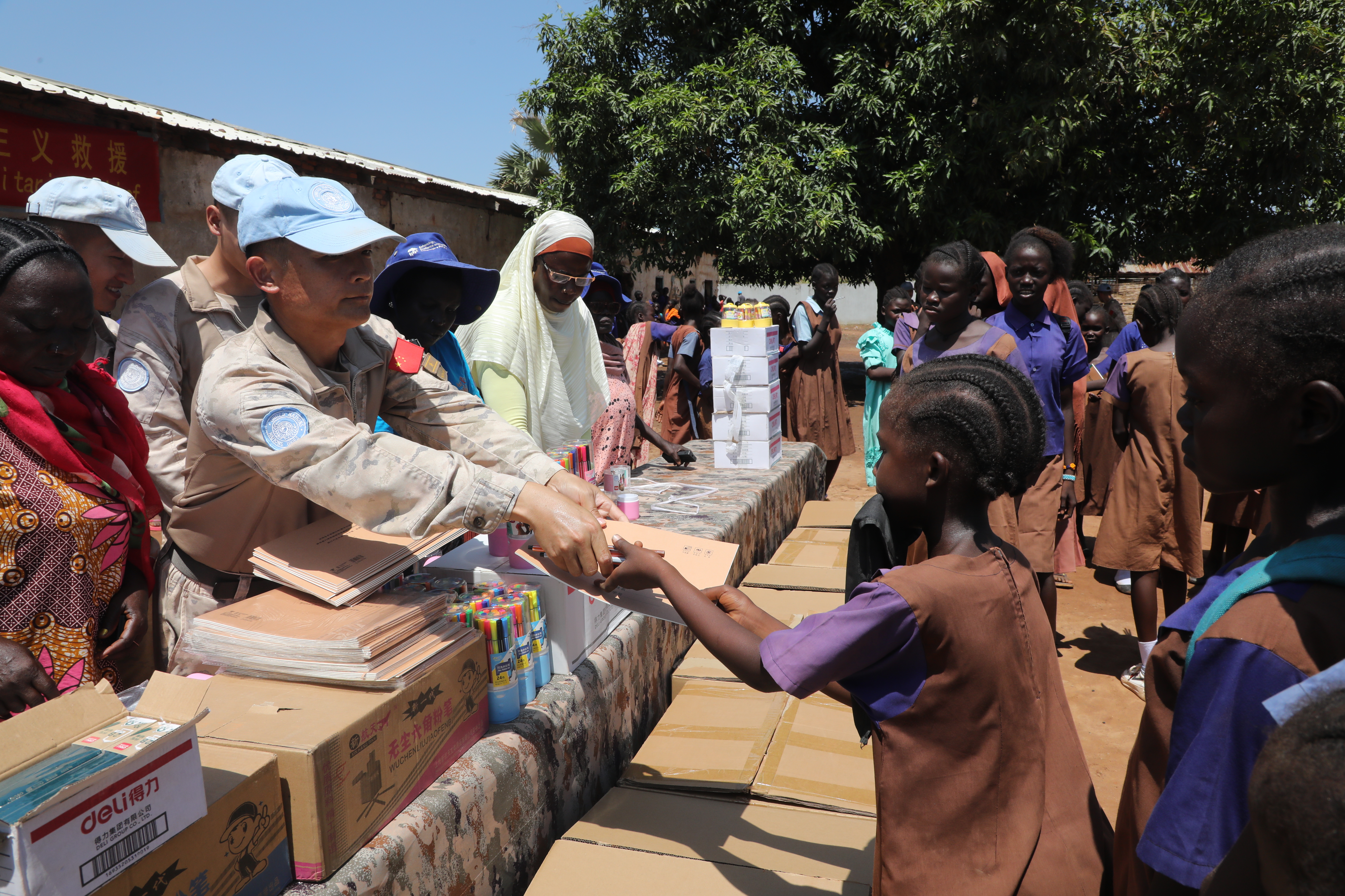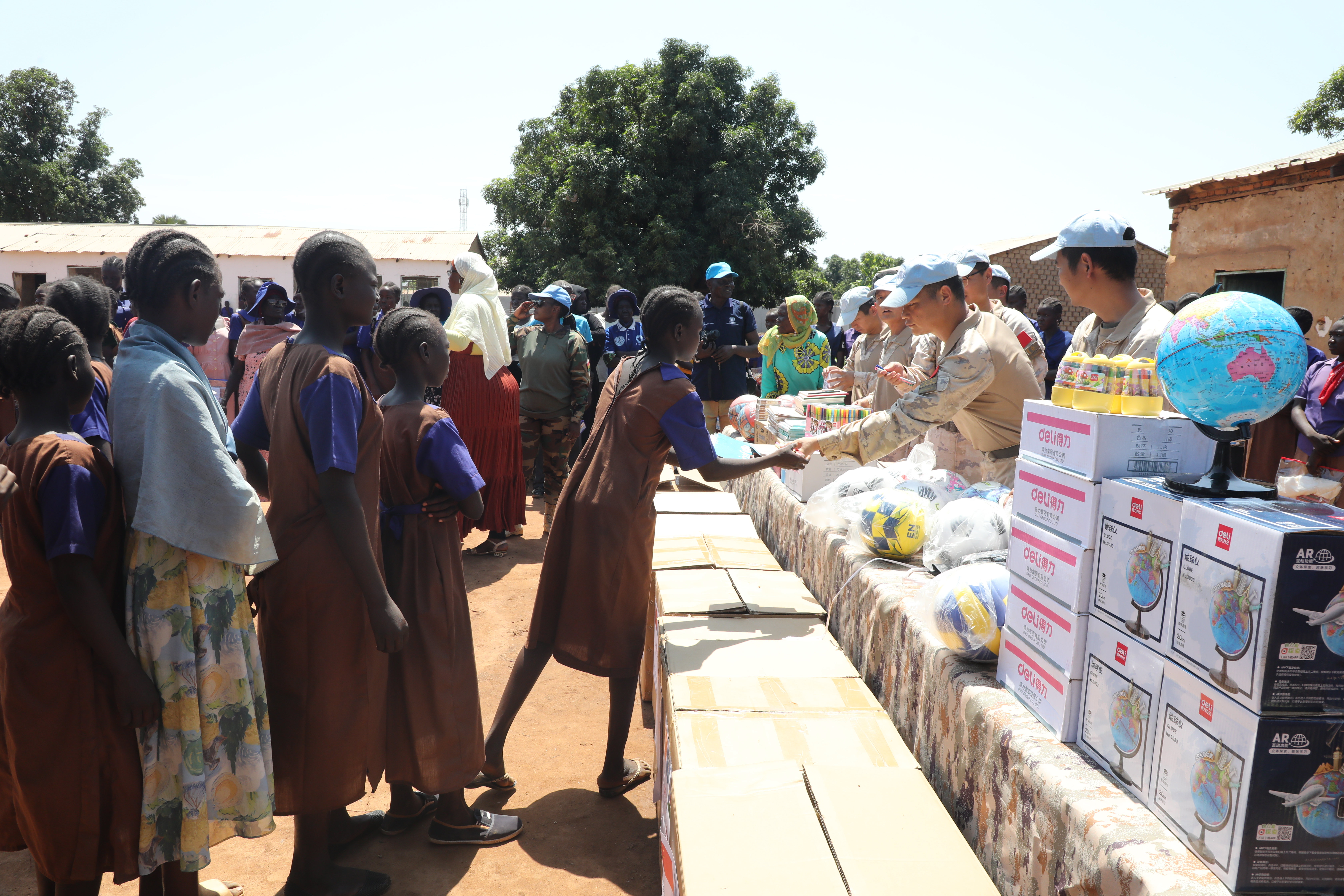 科斯蒂女子小学位于维和工兵分队营区附近,因当地局势持续动荡,学校物资异常匮乏,中国维和工兵分队了解情况后,积极筹措捐赠物资,向学校捐赠了书包、足球、篮球、水彩笔等8类1000余件办公用品,帮助他们改善日常教学及文娱条件。