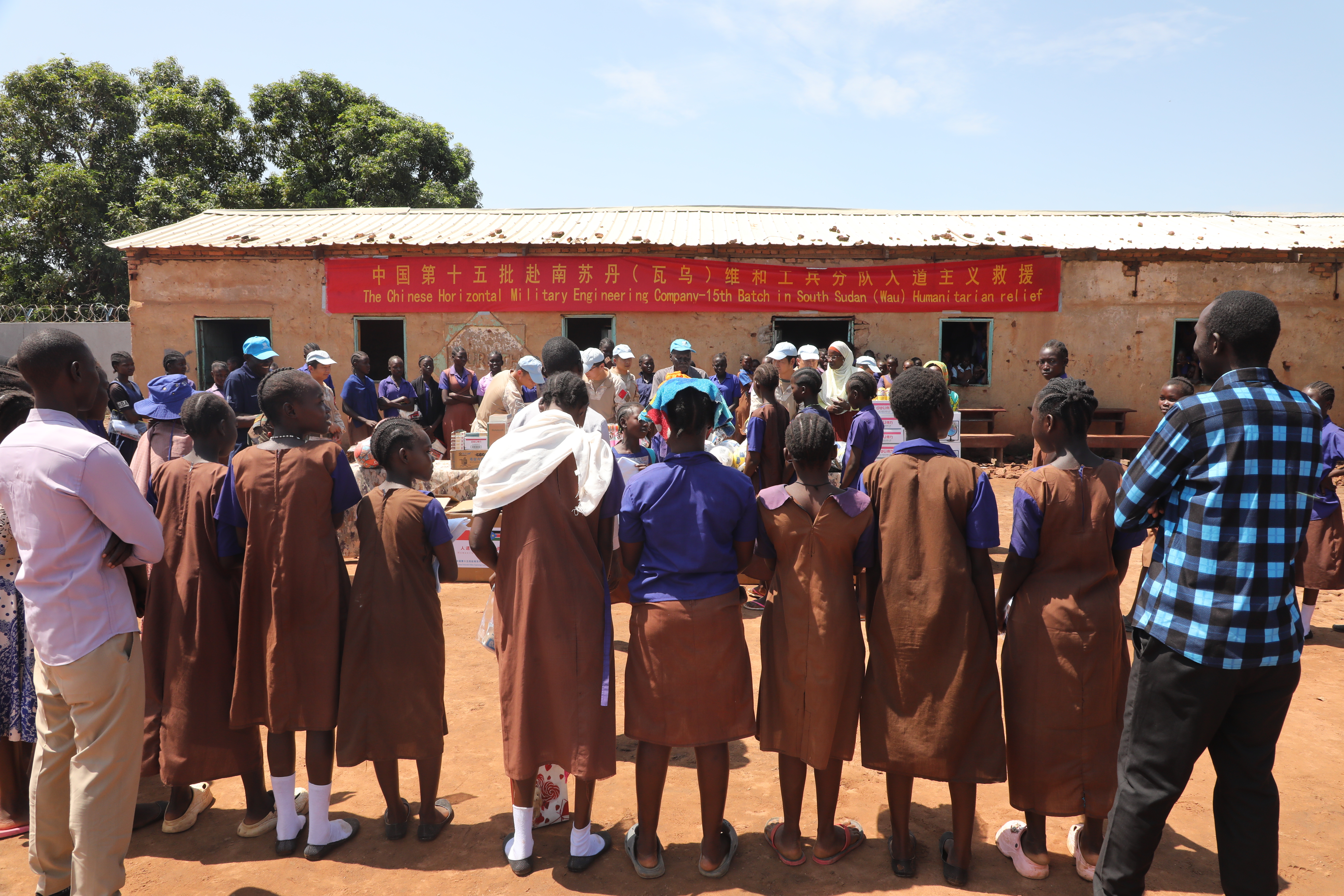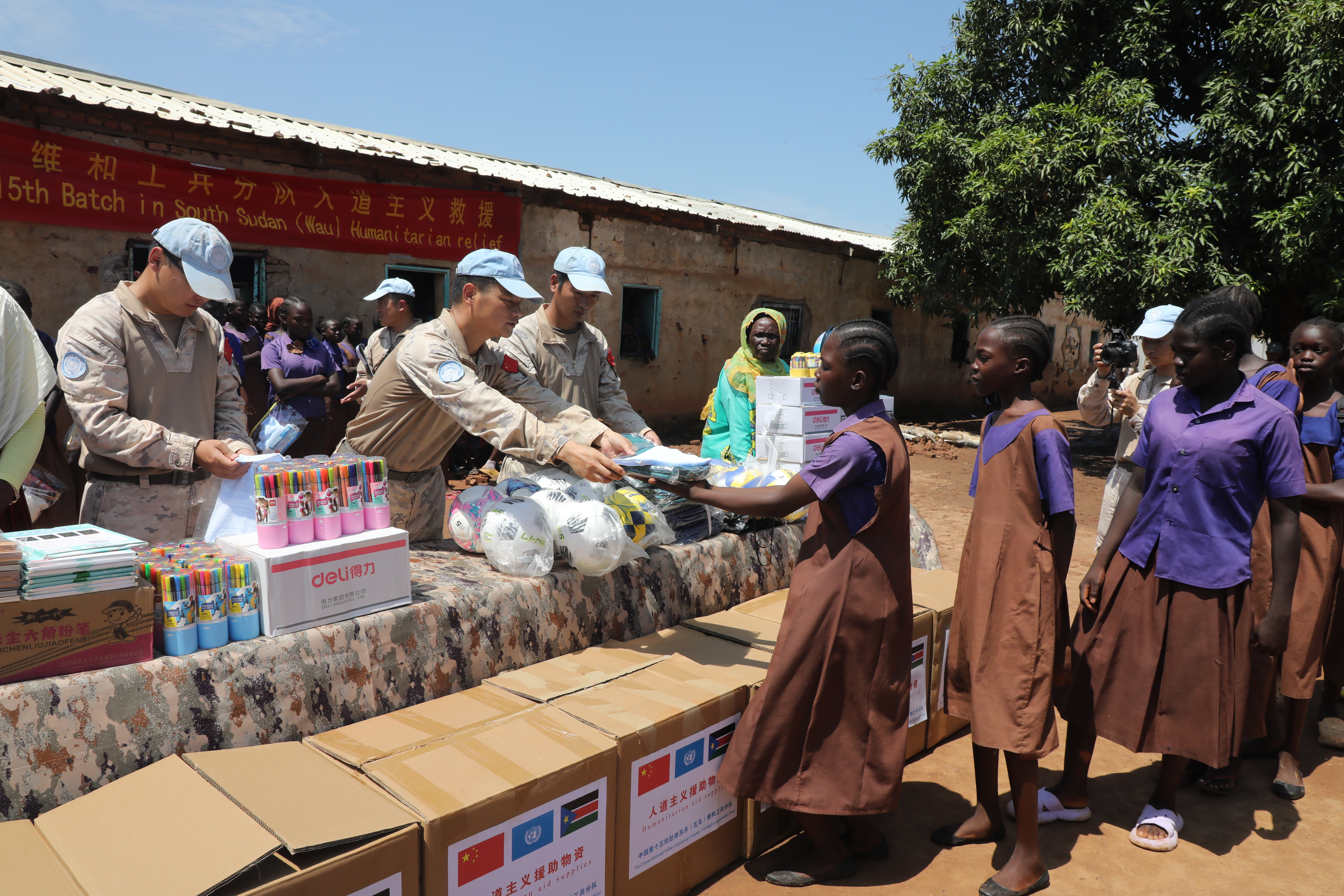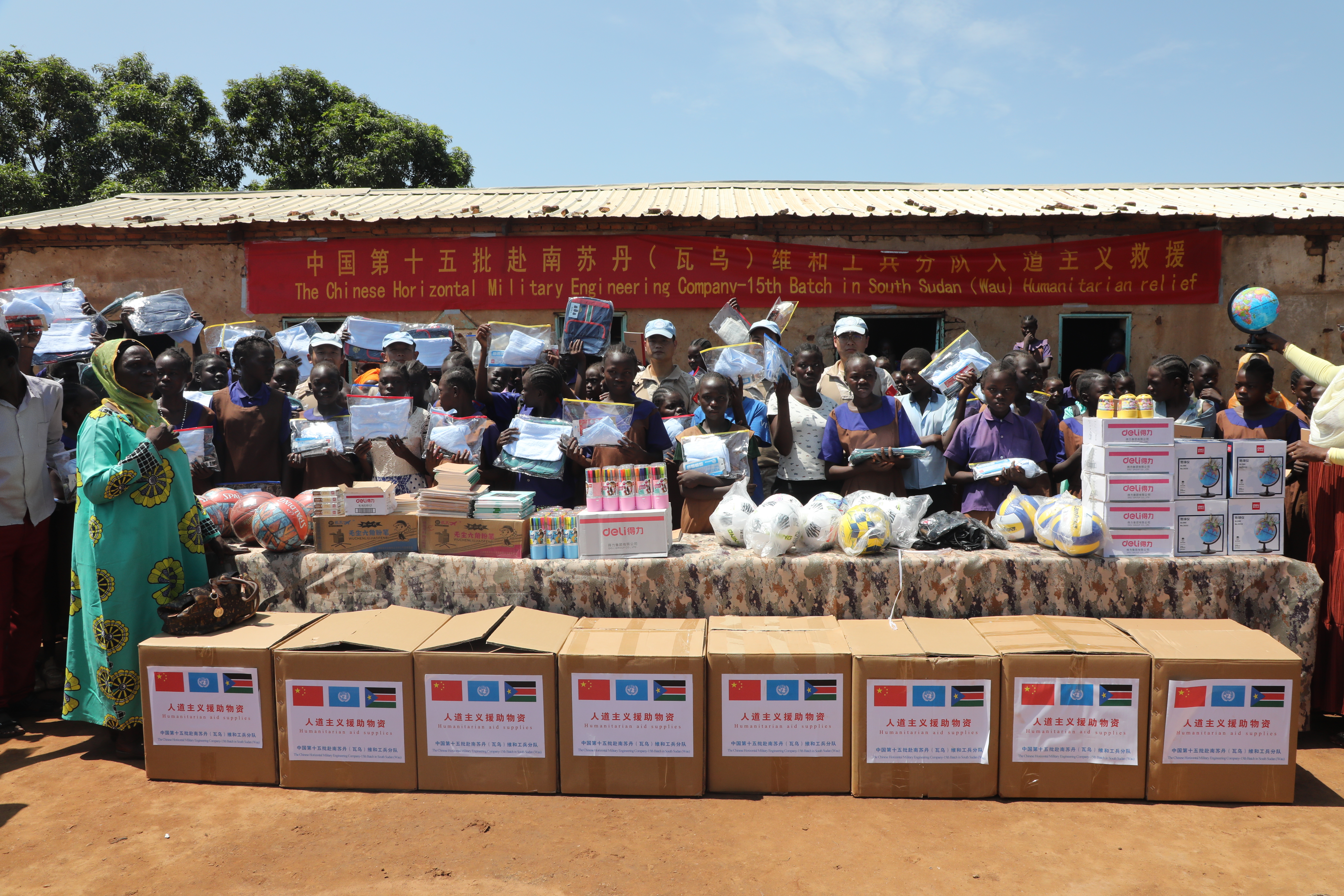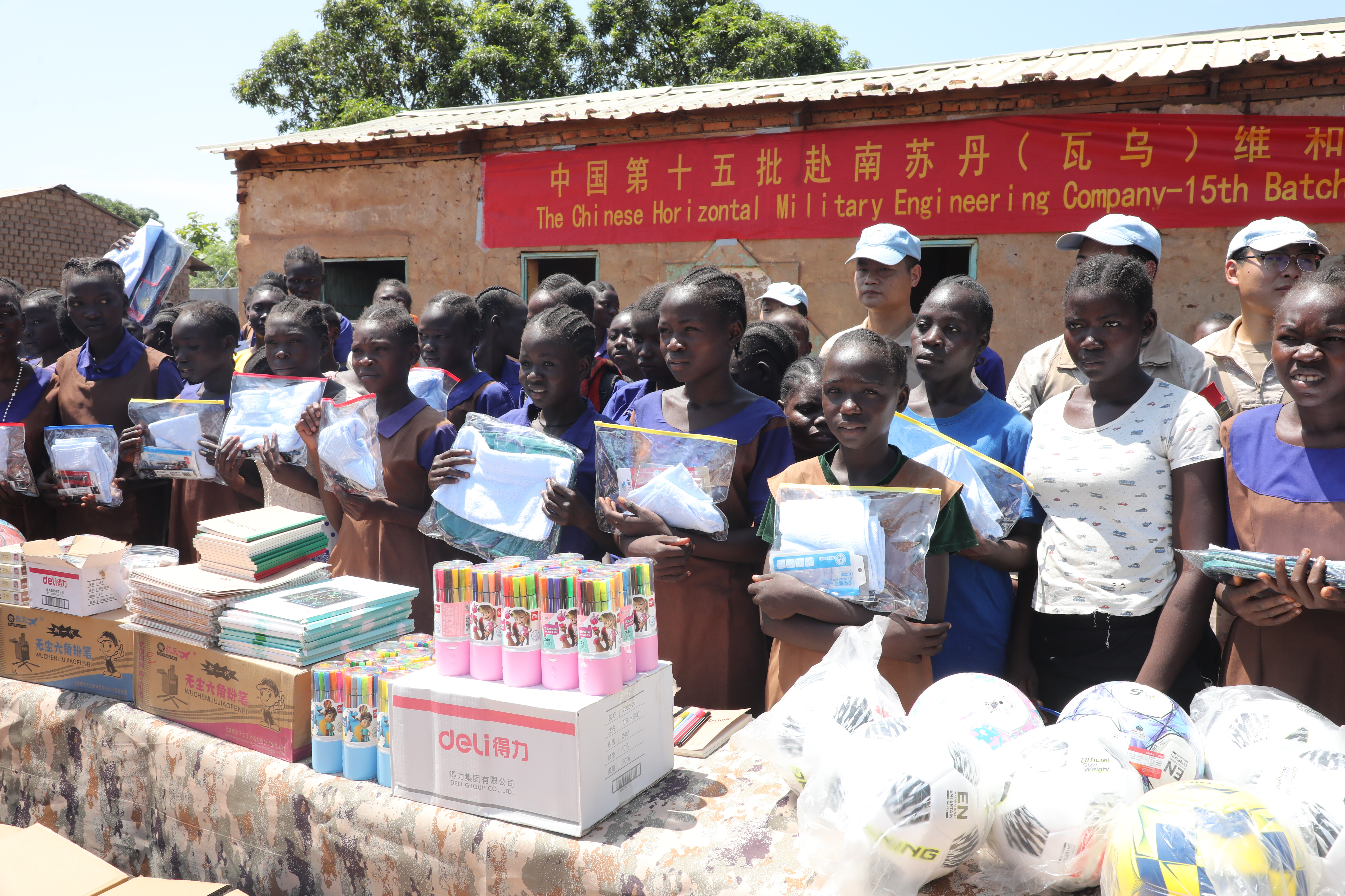 当地时间6月20日,中国第15批赴南苏丹(瓦乌)维和工兵分队来到科斯蒂女子小学,为当地师生捐赠学习用品、体育器材和生活物资,以实际行动践行人道主义精神,传递和平与友谊。