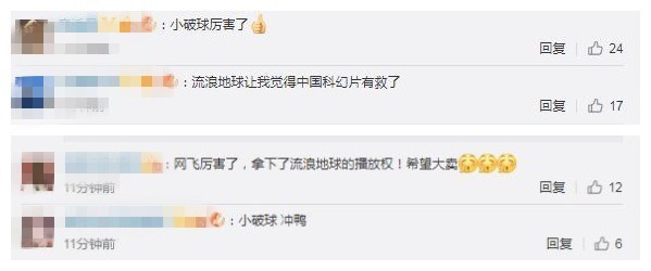不少网友在得知这一消息后,十分开心,纷纷为《流浪地球》打call:“小破求,冲鸭!”“小破球厉害了!”
