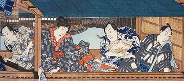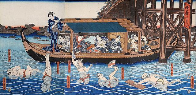 在歌川国芳的《两国之凉》中,一只“煮卖船”正在向一只“屋根船”靠近,船老板正在向屋根船中喝酒划拳的人们送上食物。