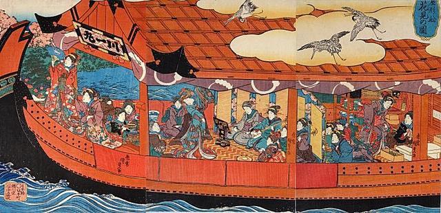 远在平安时代,“屋形船”是贵族的专享之物。但到了江户时代,它成为民间富商出行游玩的常用交通工具。当时的大名与富商们包下一只“屋形船”,一起去赏樱花,或是去看烟火大会。船只的装饰华丽无比,还有艺妓奏乐助兴。