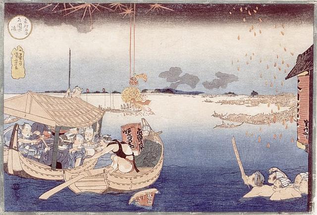 在隅田川,每年初夏河上纳凉活动开始时都会举办焰火大会。在两国周边放烟花的时候,河面上就会出现很多泛舟游玩欣赏烟花的船只。这些初夏游乐景象,都被浮世绘记录了下来。