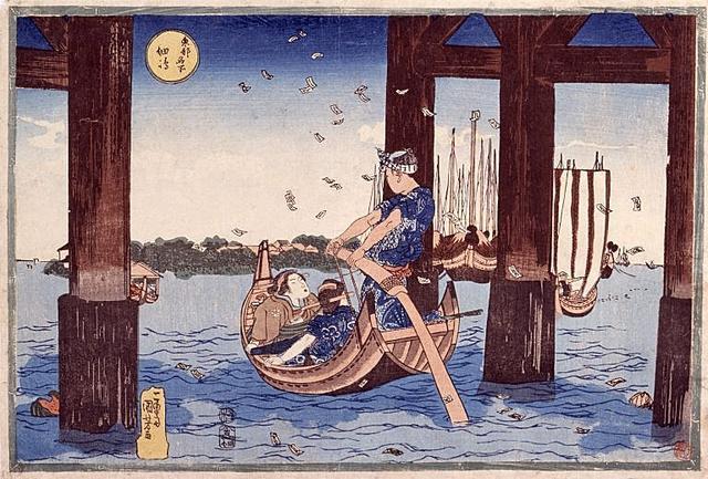 看到今天高楼林立的东京,我们可能无法想象,在几个世纪之前,这座被称为“江户”的城市中水道纵横的样子。这座被隅田川和江户湾网住的城市,素有“水之都”之称。从浮世绘中我们可以发现,在江户的水道上,有供游人泛舟戏水的游船,有给乘客渡河用的渡船,也有从日本各地聚集而来向江户运送物资的货船。