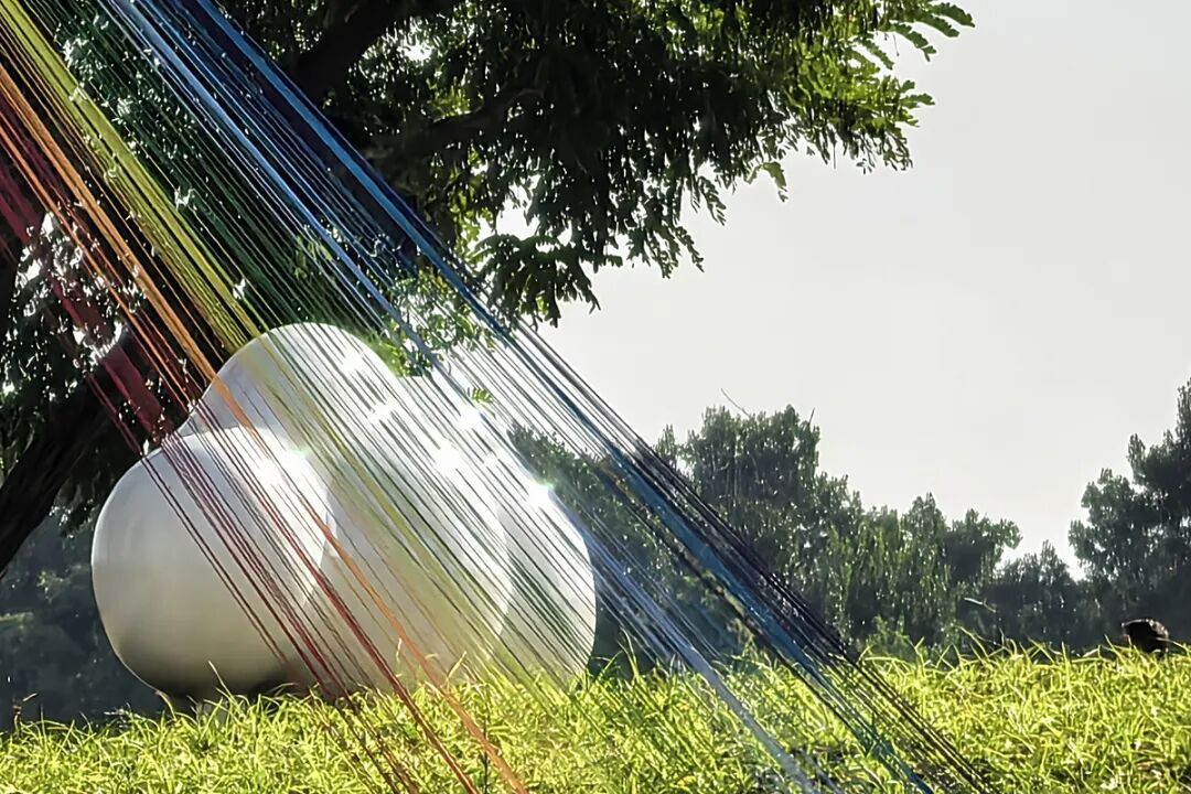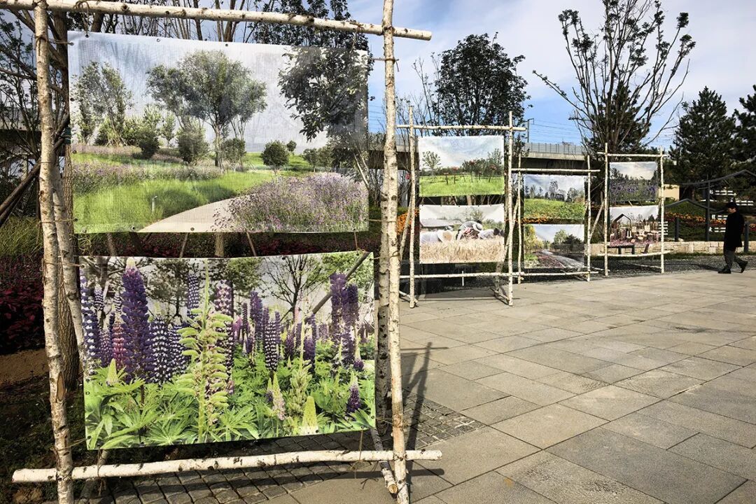 公园内还布置了“彩虹经纬”拉线艺术装置,并沿路设置“数绘温榆河”成果展,通过纱布画和现代艺术形式呈现公园建设的关键数据与影像,增强视觉互动与人文表达。