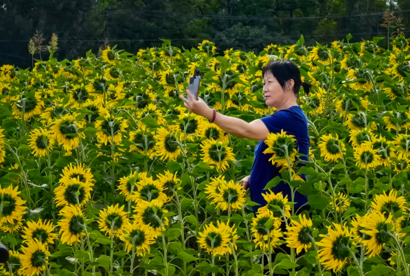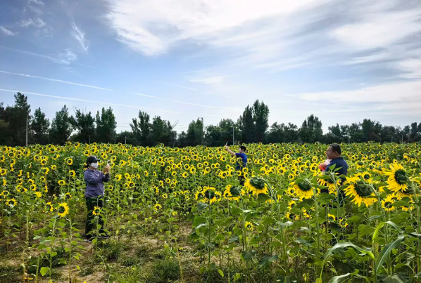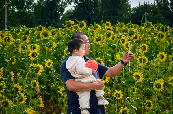“葵海云悠”装置与大面积的向日葵构成一片金色的海洋。“田影入画”相框打卡点将远山、蓝天、农田框成绝美画卷。