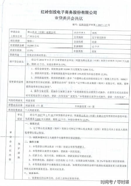 北京时间“零时差”从知情人士处了解到,红岭创投曾于2017年9月同意为辉山乳业(中国)有限公司提供10000万借款,期限12个月,年综合费率15%。2017年1月红岭创投方面对该笔借款金额、利率、担保措施等进行变更,授信额度变更为5000万元,期限12个月,年综合费率13.5%。本笔借款以直贷方式操作,借款一次性发放,“辽宁辉山乳业集团(锦州)有限公司、杨凯、葛坤提供连带责任保证担保”,并非网传的10个亿。