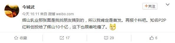 北京时间“零时差”注意到,正值辉山乳业水深火热之时,微博网友“今城武”爆料称“知名P2P红岭创投给了辉山10个亿”。