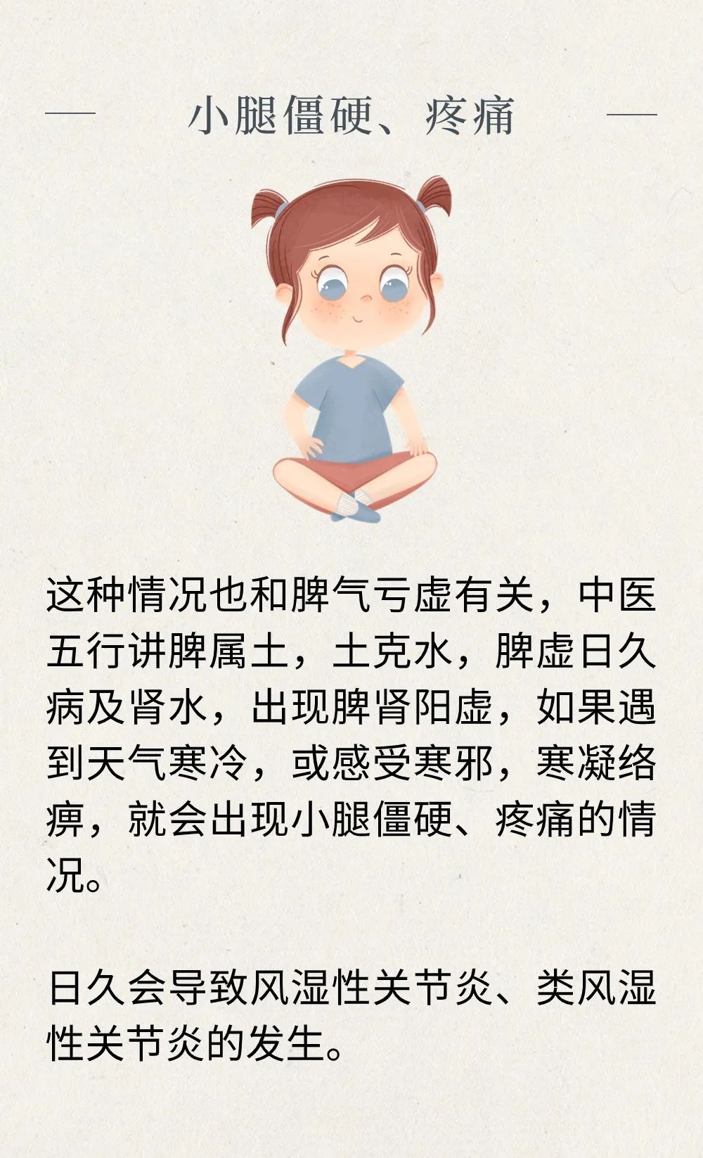 脾的正气是否充足,在小腿上往往有直观反映。脾胃健运,则肌肉丰满、壮实,四肢强劲有力;脾失健运,则肌肉瘦削,甚或痿废。