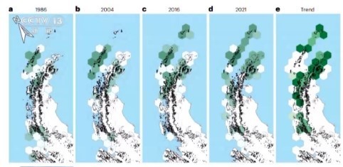 英国埃克塞特大学环境科学家研究发现,在整个南极半岛上正在广泛地变绿。植被覆盖面积从1986年的0.863平方千米增加到2021年的11.947平方千米,而且植被扩张速度也在变快。