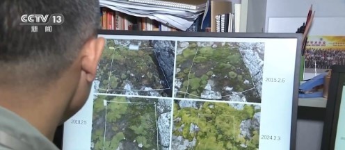 中国科学院植物研究所研究员姚轶锋:我们这些年在南极菲尔德斯半岛做植被监测,监测1米×1米样方里南极发草面积的改变与环境之间的相关性。对比2013年1月17日拍的照片,看到南极发草在逐步扩张,到了2024年面积基本上占到了70%左右。