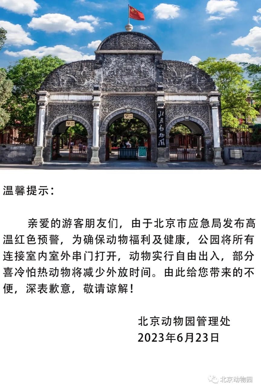 6月23日,北京动物园发布温馨提示,表示因市应急局发布高温红色预警,为确保动物福利及健康,公园将所有连接室内室外串门打开,动物实行自由出入,部分喜冷怕热动物将减少外放时间。由此带来的不便,深表歉意,敬请谅解。