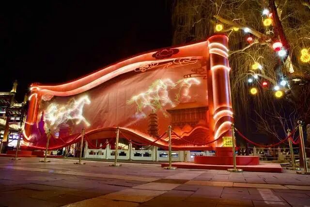 在什刹海荷花市场,一处马主题的景观装置格外引人注目。3.5米*10米的大屏设计成画卷样式,水墨质感的马群每隔一分钟就会奔腾而来,仿佛要从画中跃出一般,与周边璀璨灯火交相辉映。