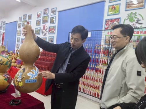在葫芦文化特色展厅,琳琅满目的师生创作作品展现了学校“小葫芦·大教育”的劳动教育实践成果。学校负责人详细介绍了从葫芦种植、加工到文创设计的完整课程体系,生动呈现了以劳树德、以美育人的办学目标。
