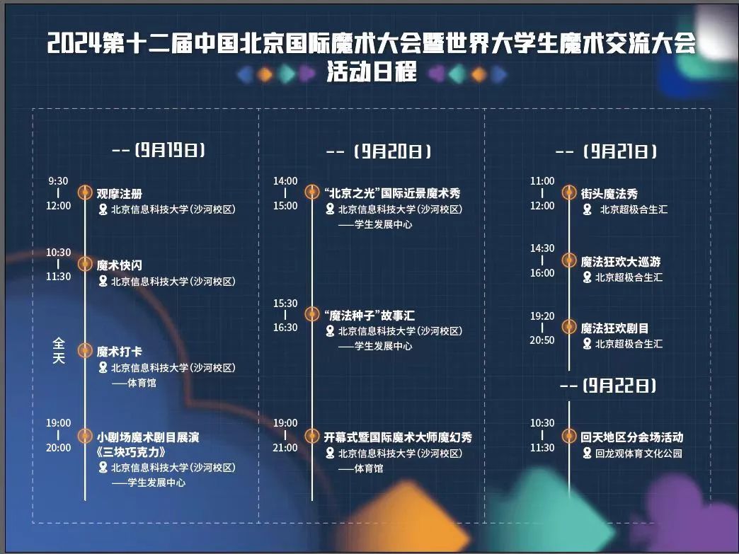 本届魔术大会除了北京信息科技大学(沙河校区)主会场外,还在北京超极合生汇、回龙观体育文化中心设立了分会场。9月21日,在北京超极合生汇分会场将开展街头魔法秀、魔法狂欢大巡游、魔术剧目等演艺内容,同时将开展促消费系列活动,大学生群体可凭学生证享受消费优惠,市民和游客也可以凭借魔术大会开幕式门票,到北京超极合生汇领取优惠礼包,进一步激活商圈消费活力。