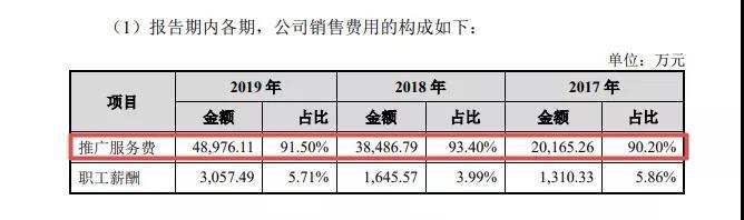而在销售费用的构成中,推广服务费又是最高的,报告期内占比90%以上。报告期内,2017年、2018年和2019年苑东生物推广服务费分别为2.02亿元、3.85亿元元和4.90亿元,占各期销售收入比例分别为42.33%、50.06%和51.70%,增长较快。