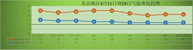 本周双休日两天,京城天空云量仍然较多,白天最高气温将稳定在13℃左右。预计下周前期,北京天气平稳,16日(周三)开始冷空气再次来袭,气温跌落明显,预计到17日最高气温跌至10℃左右。南郊观象台从11日到19日最高气温10℃至15℃,最低气温2℃至5℃。