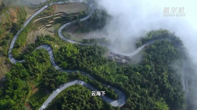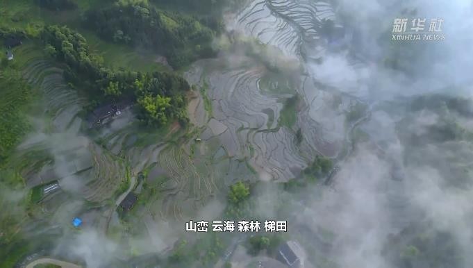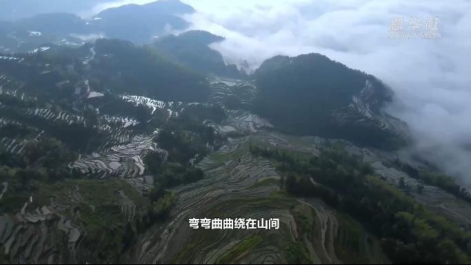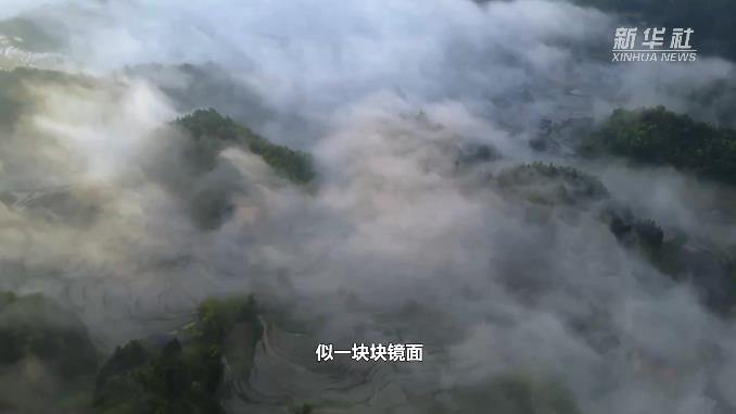 雨后初晴,湖南省新化县紫鹊界梯田云雾缭绕。云海下,盘山公路似一条玉带,弯弯曲曲绕在山间。浸满水的梯田,似一块块镜面,将景色倒映。远处,云海缥缈,好似将山峦披上一层薄薄细纱。山峦、云海、森林、梯田,构成了一幅优美的水墨丹青画卷。