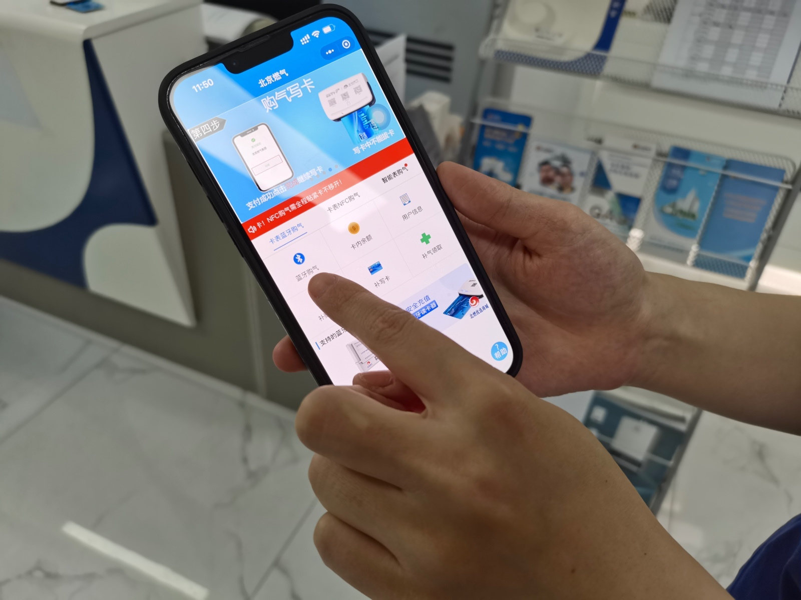 您可持燃气卡,前往银行或使用自助终端机、智能写卡终端进行购气。用户可以进入“北京燃气”APP,点击主页的“服务网点”,选择“自助售气终端网点”即可跳转到服务网点列表界面。或点击“智能写卡终端”,查询附近的写卡设备。