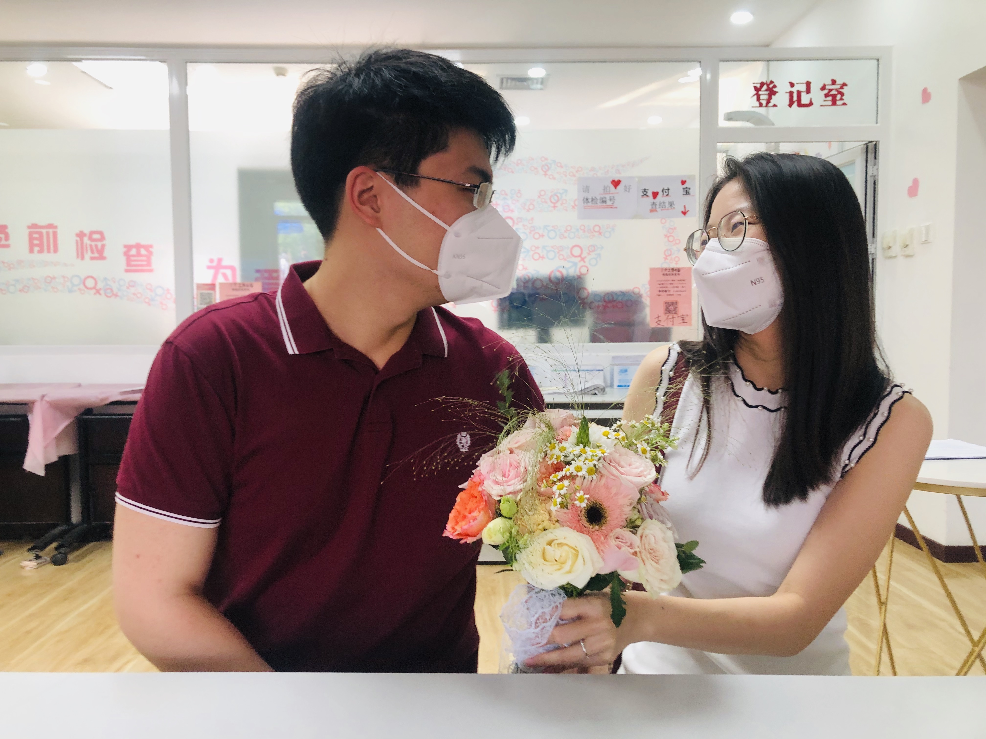 由于登记预约量大,日常各婚姻登记机关提供的宣誓颁证、新婚讲堂、婚姻家庭辅导和上门服务等非婚姻登记法定程序的各项延展性服务都暂停开放。记者注意到,现场很多新人选择在登记这天穿上了情侣服装,还有一些新人拿着鲜花拍照留念。
