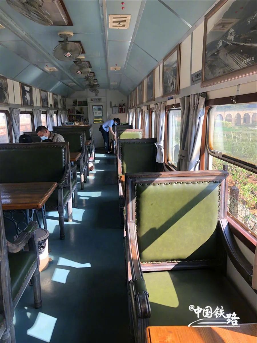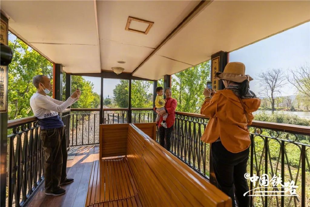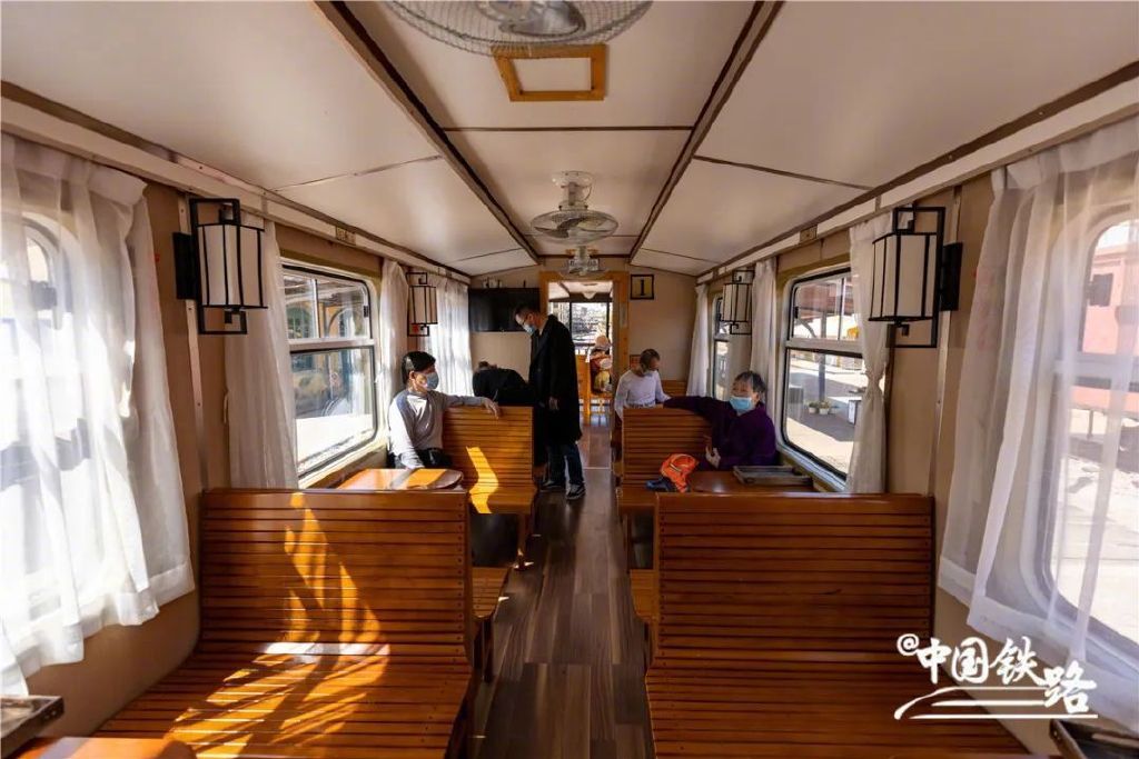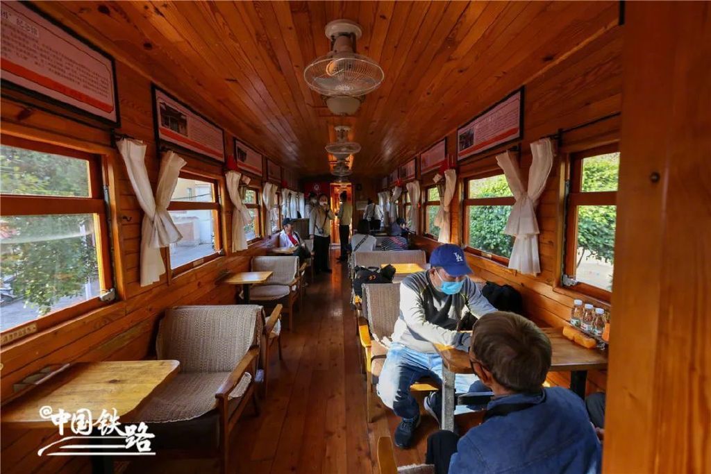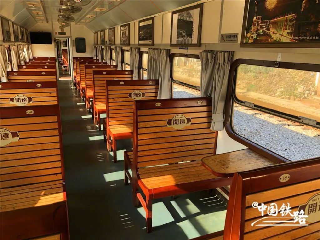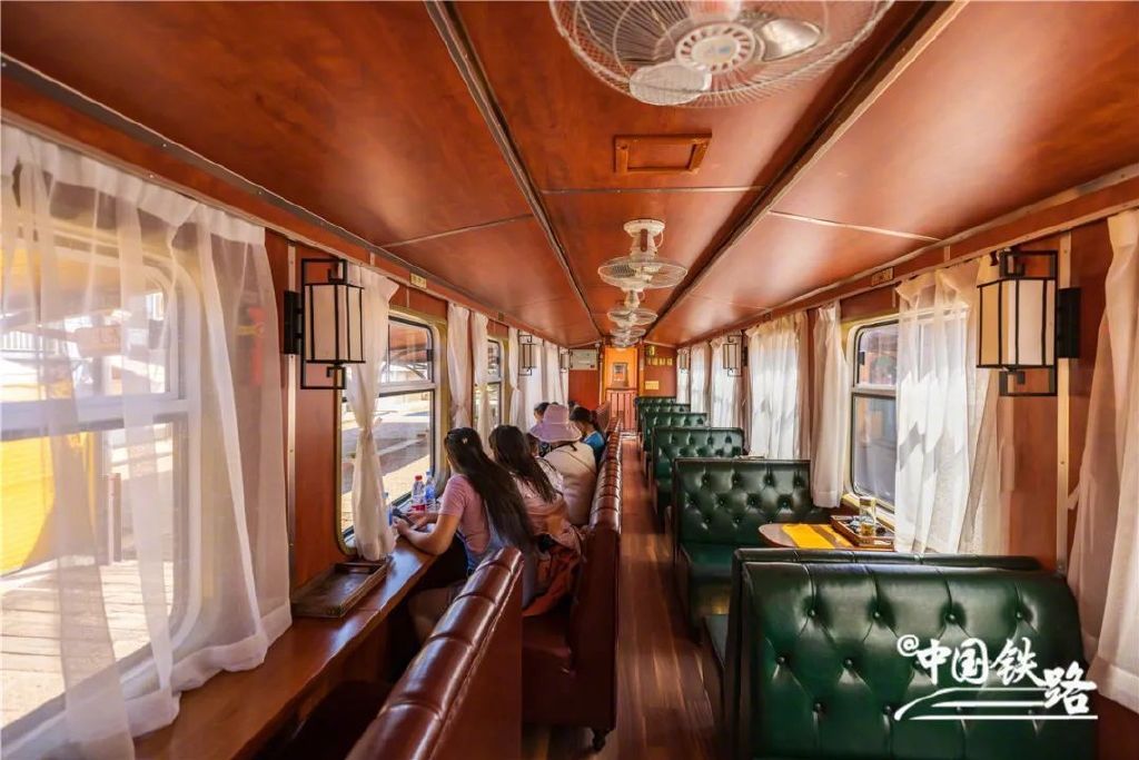 列车分为硬座和软座,装饰古朴雅致,每趟列车均挂有一节敞开式观光车,供旅客拍照打卡。