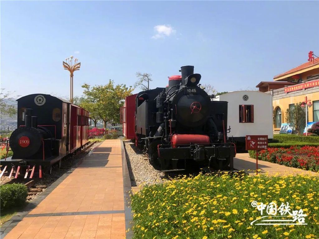 车站对面的铁路主题公园内展示着米轨、寸轨列车和轨道,游客可以在此直观感受准轨、米轨和寸轨轨距长短、列车大小的差别。