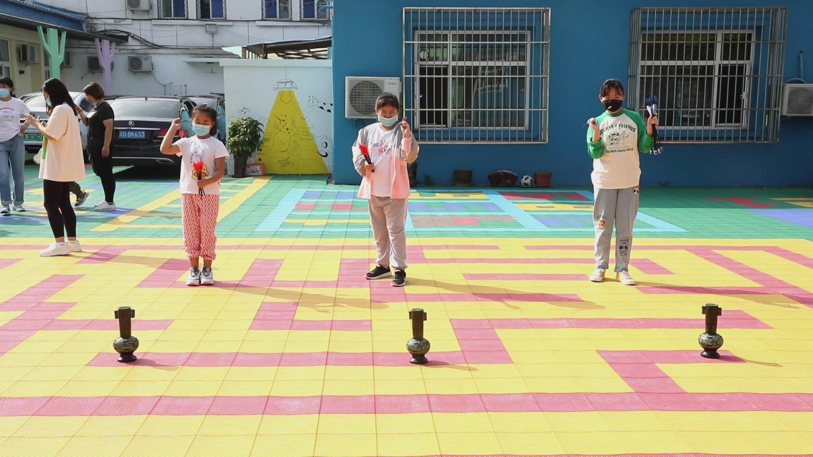 在室外,孩子们还参与了投壶游戏,感受传统文化的乐趣。