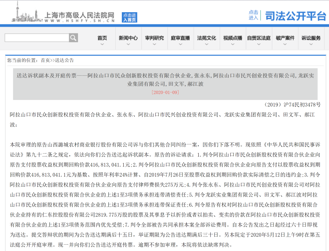 据公告,潞城农商行要求阿拉山口市民众创新股权投资有限合伙企业支付股票收益权到期回购价款约4.17亿元;按照年利率24%计算、支付自2019年7月26日至股票收益权到期回购价款实际清偿之日的违约金;支付律师费损失275万元;请求折价或变卖、拍卖阿拉山口市民众创新股权投资有限合伙企业持有的2819.775万股仁东控股股票,首先受偿债务。