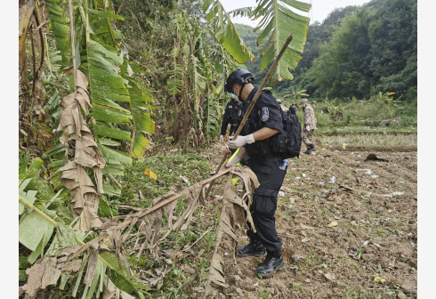 广西藤县公安局民警在坠机现场周边搜救(手机照片)