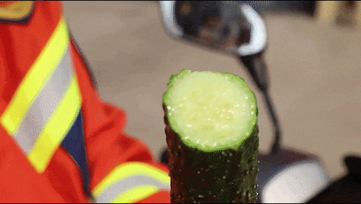 当消防员手中的黄瓜撞上风筝线时,几乎一瞬间,黄瓜被一分为二,切口平整得如同被“刀”割开。