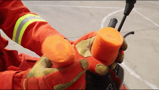 接着,消防员又测试了稍硬的胡萝卜和苹果,结果同样被轻松割开。