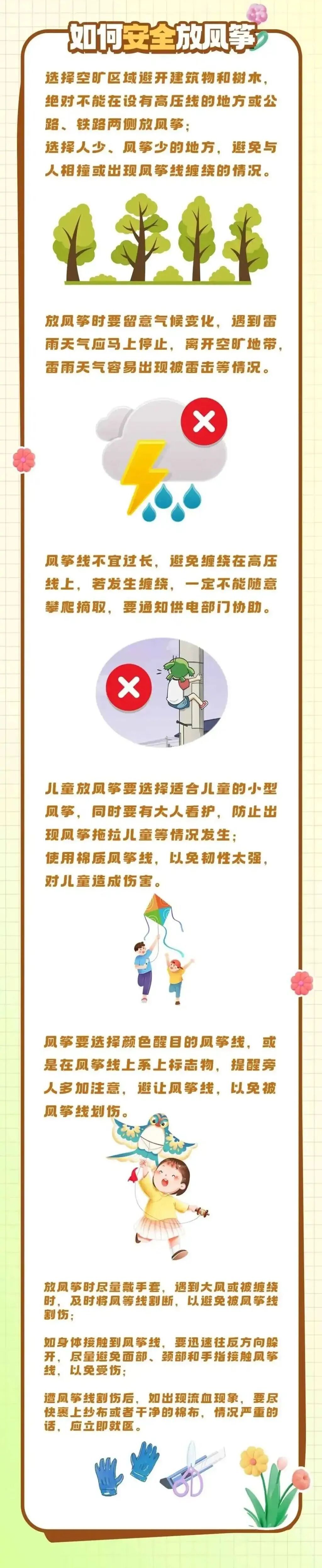 风筝线通常为白色、灰色或透明状,在远处极难被发现,特别是在阳光刺眼的白天,无异于给行人布下“天罗地网”。放风筝时应如何避免伤到人?快戳下图了解↓