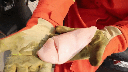 随后,消防员用猪肉和鸡肉模拟人的皮肤,来测试风筝线的锋利程度。风筝线划过,猪肉和鸡肉上均出现几厘米深的切口。