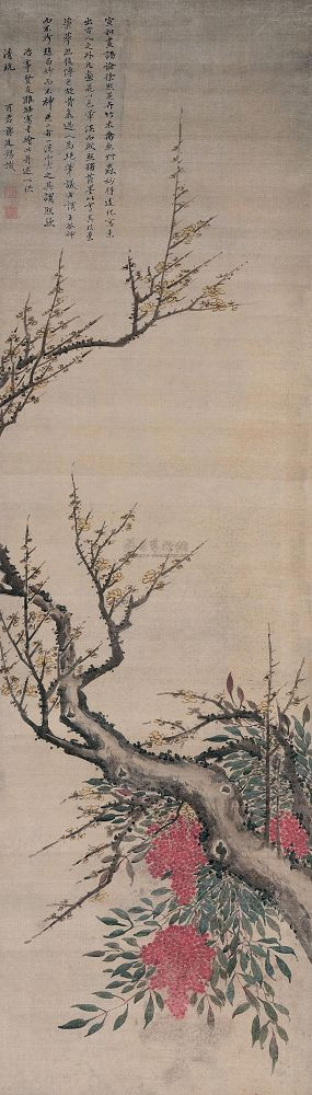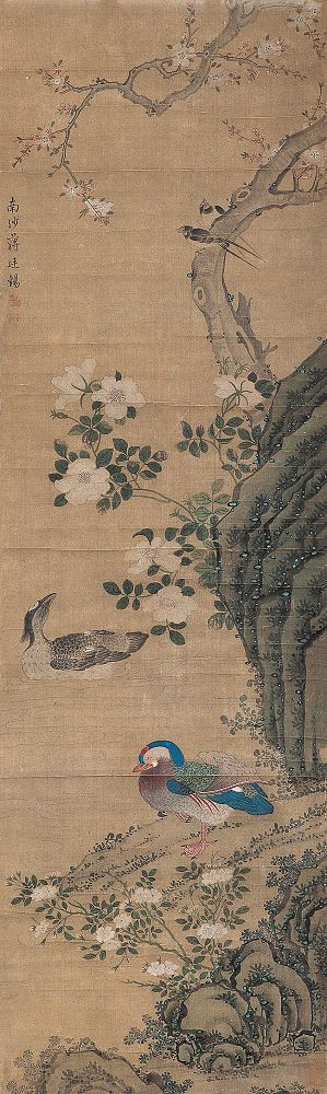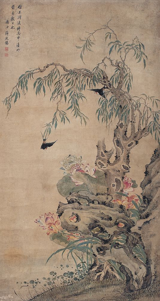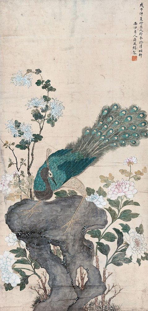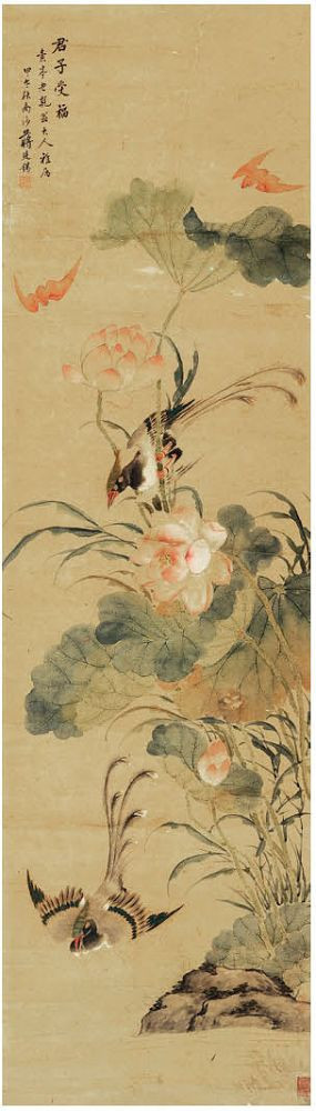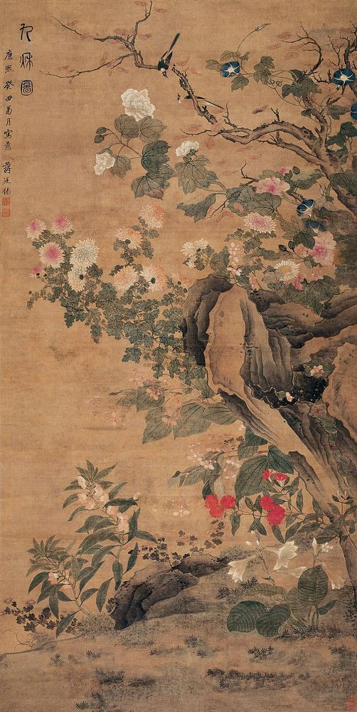 尺寸:174×61cm 创作年代:1720年作 题识:庚子仲秋月,写于翰墨山房,西谷外史蒋廷锡。 钤印:蒋氏廷锡 说明:吕迪题跋。 蒋廷锡(1669-1732),江苏常熟人。字扬孙,一字酉君,号南沙、西谷、青桐居士,江苏常熟人。康熙四十二年进士,雍正年间曾任礼部侍郎、户部尚书、文华殿大学士。清代康熙、雍正年间的著名花鸟画家,变恽南田没骨法之纤丽,开创“蒋派”花鸟画。