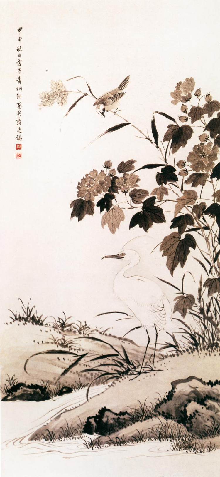 立轴,纸本,设色,纵127.7厘米,横60.5厘米。北京故宫博物院藏。 此画描绘芙蓉、苇草,溪边一只鹭鸶侧立,苇竿上栖息一鸟,俯瞰鹭鸶,形态生动。用简括几笔,勾出鹭鸶的生动神韵,风格独具。花鸟生动自然,无雕琢之痕。用淡墨渲染枝叶,焦墨点缀花蕊,笔墨中略加赭色,淡逸雅致。