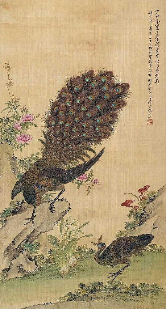 尺寸:134×73cm 款识:一身金翠尽不得,万里山川来者稀。壬午年长至后二日仿北宋徐崇嗣本廷供奉臣蒋廷锡画。 钤印:[臣酉君印]