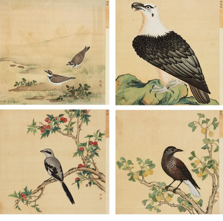 尺寸:41×41cm×4 钤印:臣廷锡(四次)、朝朝染翰(四次) 说明:每幅之侧,分别有松花、寒露、金眼、狗头雕小签。 《鸟谱》最早为蒋廷锡所绘,共十二册,每册三十页,着录于《石渠宝笈初编》,今已不知下落。现存鸟谱为乾隆十五年宫廷画家余省、张为邦根据内府所藏蒋廷锡原本,历时十一年摹成,亦为十二册,其中1-4册现存台北故宫,5-12册现存北京故宫。 此四开,早年流出海外,左侧对题已为人截去,现据右上方所题知为“寒露、松花、金眼、狗头雕”等四开,其中,“寒露”一开背后有墨书“十”、“廿五”等字样,或即表明为第十册第二十五开,为装裱成册时所书序号。所钤“臣廷锡”、“朝朝染翰”二印亦与《石渠宝笈》所记相同,在蒋廷锡原作已不存的情况下,有此四开或可窥其原作之一斑。