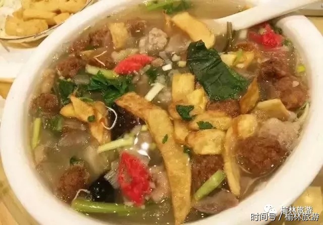 羊杂碎是榆林特色小吃,羊杂碎由头、蹄、血、肝、心、肠、肚等混合烩制而成,为了追求口感,有些杂碎中加入了羊蹄,其中羊脑是非常重要的一种辅料,这样的做法符合了“榆林人爱吃羊杂碎,有头有蹄有肝肺”的说法。每天早晨,大多数榆林人都会大快朵颐地喝上一碗热腾腾的羊杂碎,然后开始一天的生活。