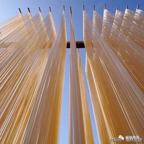 一排排挂梁,几十杆千丝万缕的挂面,在太阳的映照下,泛着淡白色的光,仿佛一条条银丝门帘挂在眼前。如果你来到榆林吴堡,这样的手工空心挂面制作场景应该并不少见。榆林手工空心挂面用优质面粉加工,经过十几道纯手工工序拉伸完成,以小麦精粉、精盐为原料,整个制作流程需20个小时左右方可完成,制成后内有银丝般细孔,其光洁度好、耐煮沸、煮后不浑汤,再配陕北羔羊肉、鸡汤、肉汤等,味道极佳、营养丰富,特别适合老人、孩子、孕妇等体虚者食用。