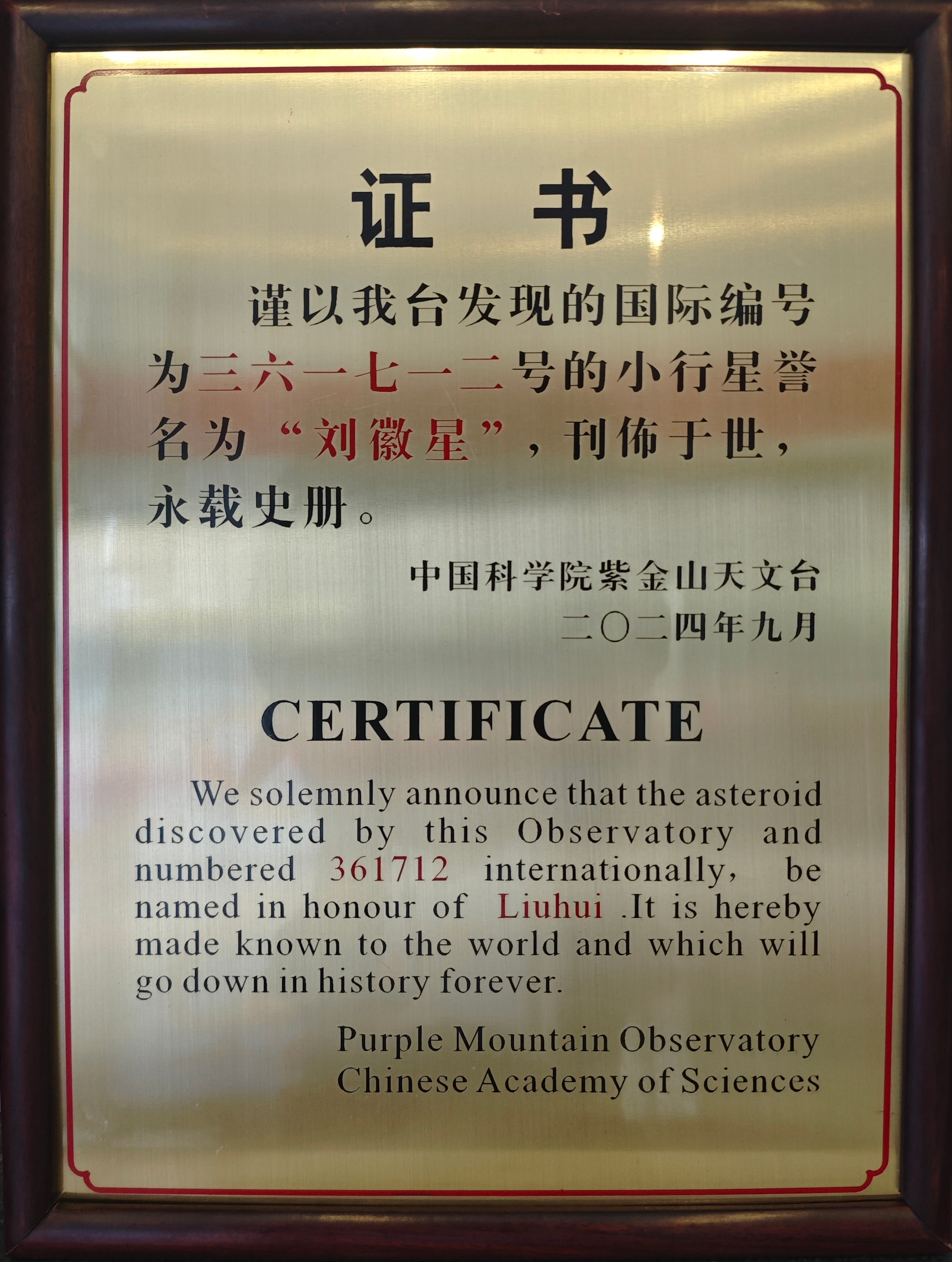 本次活动中,中国科学院紫金山天文台发现的编号为三六一七一二号的小行星被冠以中国魏晋时期数学家刘徽的名字,命名为“刘徽星”。据介绍,“刘徽星”最初由紫金山天文台盱眙观测站于2007年11月5日发现。2024年9日,经紫金山天文台申请,国际天文学联合会正式批复,这颗小行星得以以刘徽的名字命名。这颗小行星的命名是对刘徽及其代表的中国数学的崇高敬意。
