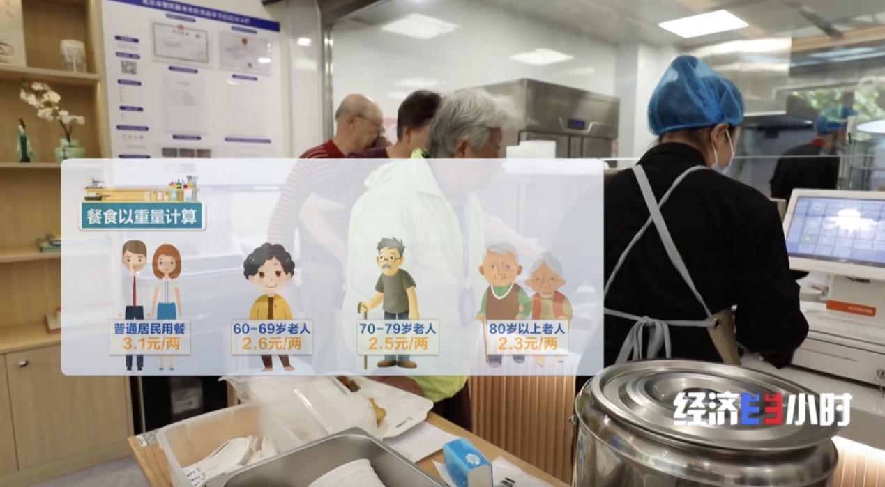这个餐厅,餐食以重量计算,普通居民用餐每两3.1元,60—69岁老人每两2.6元,70—79岁老人每两2.5元,80岁以上老人每两2.3元,且80岁以上的老人还可以选择一荤一素一主食的9.9元套餐。
