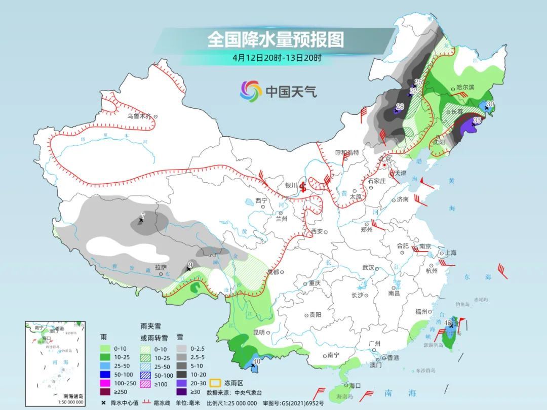 预计今天夜间到明天,内蒙古东部、东北地区东部、河北北部等地部分地区有小到中雪或雨夹雪,其中,内蒙古中东部、黑龙江西北部、吉林东部、辽宁东北部等地部分地区有大到暴雪,局地大暴雪。