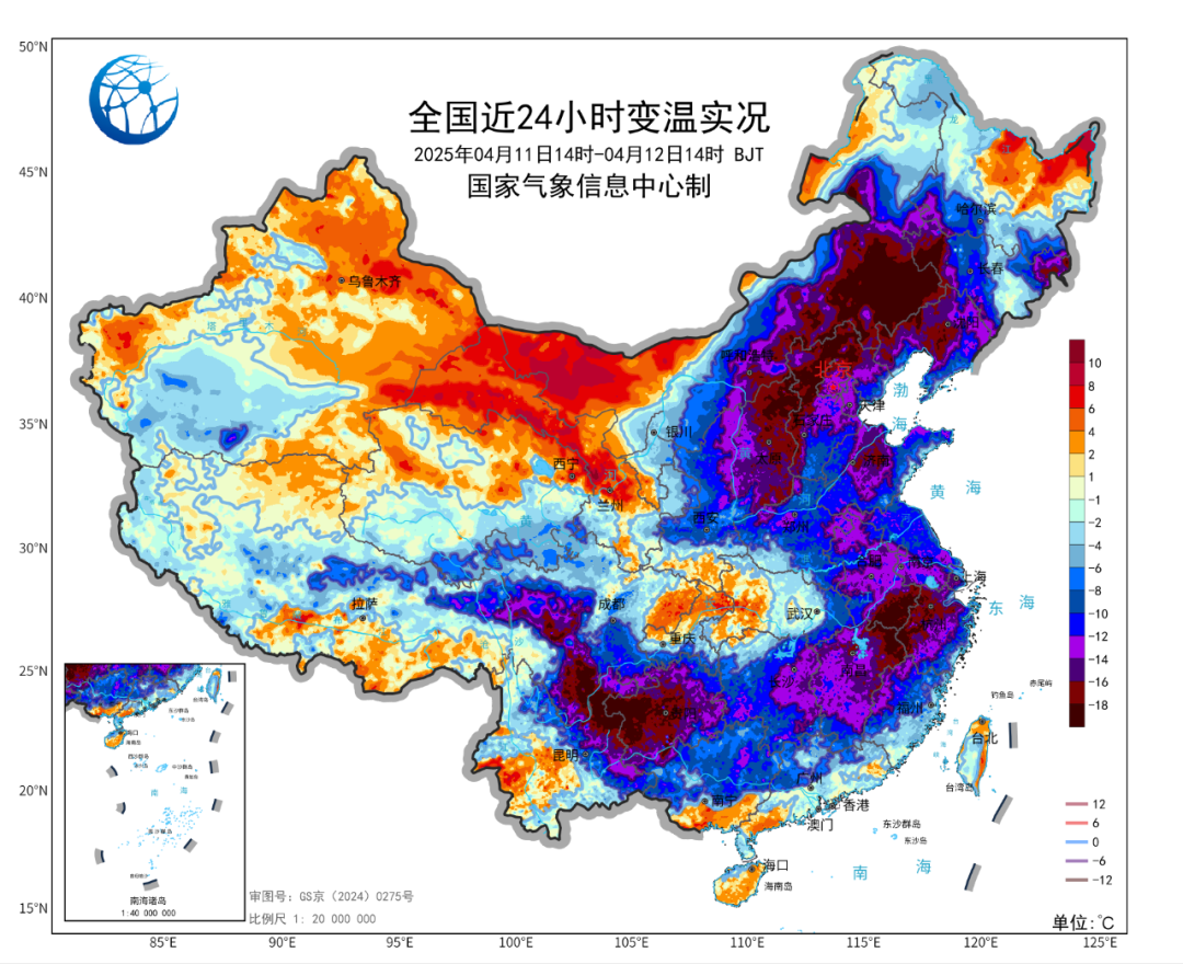 冷空气带来的降温也不容小觑,今天中东部大部都出现了降温,华北、东北南部、江南北部以及西南部分地区降幅达到16℃至20℃,内蒙古、山西、安徽、江西、贵州、四川多地降幅超过20℃。