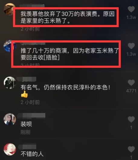 看到这样的大衣哥,网友们还在评论区说:“推了几十万的商演,因为老家玉米熟了,要回去收。”“整个村因为他膨胀了,他却还是最初的样子。”