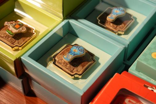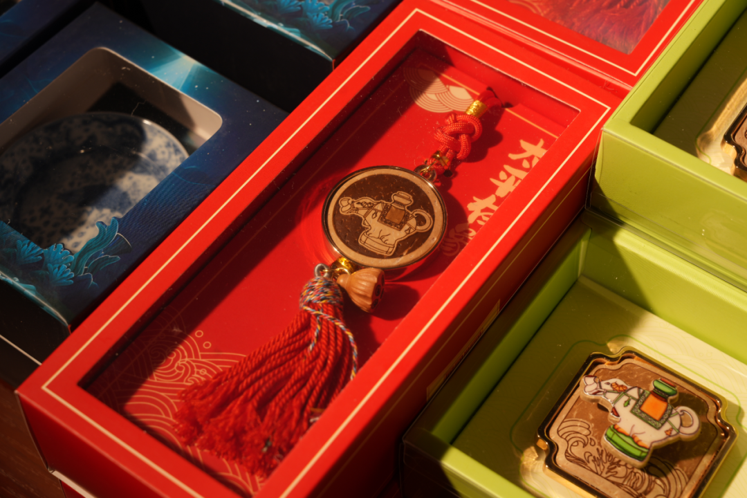 此外为本次特展专门设计的旋转流沙冰箱贴也深受欢迎,这款冰箱贴的中间为一个六等分的圆盘,格子内是素三彩象形执壶、素三彩鹭形执壶、素三彩螺形执壶等文物。