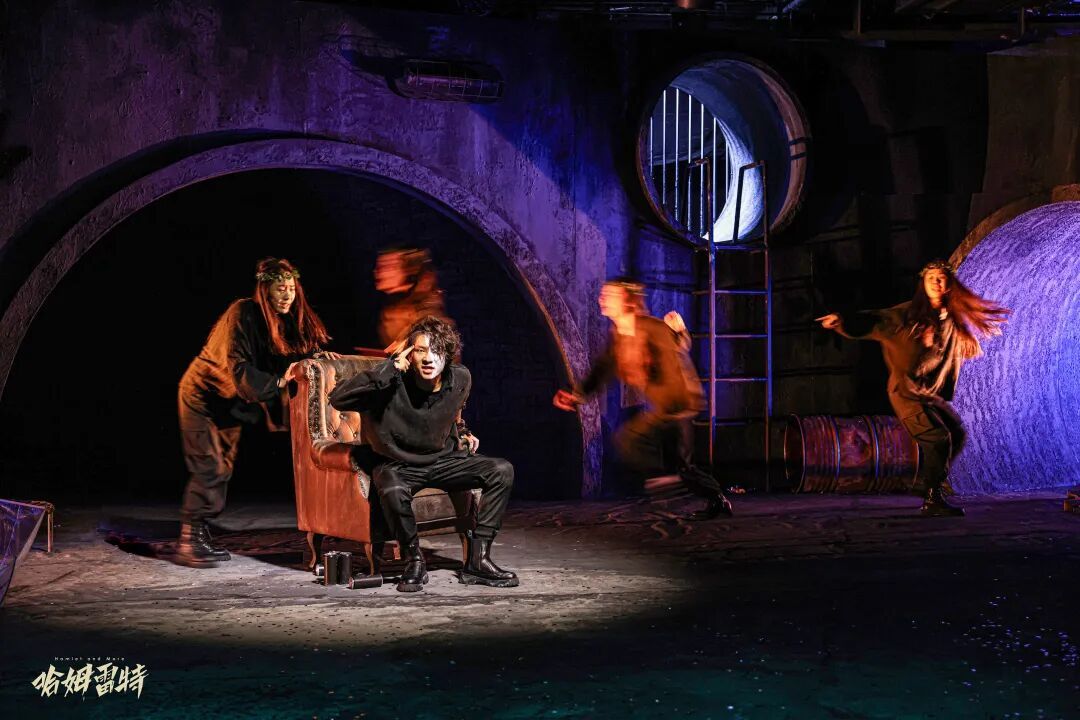 《哈姆雷特》的舞台呈现同样充满探索精神。在小剧场的有限空间里,一人分饰多角已是常见手法,但这四位年轻演员仅凭一件道具或一个转身,便实现了角色的自由切换。演出过程中,他们频繁打破“第四堵墙”,与台下观众互动,邀请大家共同参与这场戏剧“游戏”。更为独特的是,舞台上不见宫殿与城堡,取而代之的是一座由管道、水泥墙构成的“地下城”,演员身着时下流行的“工装风”服饰,或滑着滑板,或跳着蹦床,将青春的活力注入表演。电钢琴、吉他、非洲鼓的现场演奏,伴随原创歌谣的反复吟唱,共同营造出一版极具探索性与当代青春气息的《哈姆雷特》,再次印证了“一千个人眼中有一千种哈姆雷特”。正如艺术指导冯远征所言,这是一部“充满青春张力的《哈姆雷特》”。