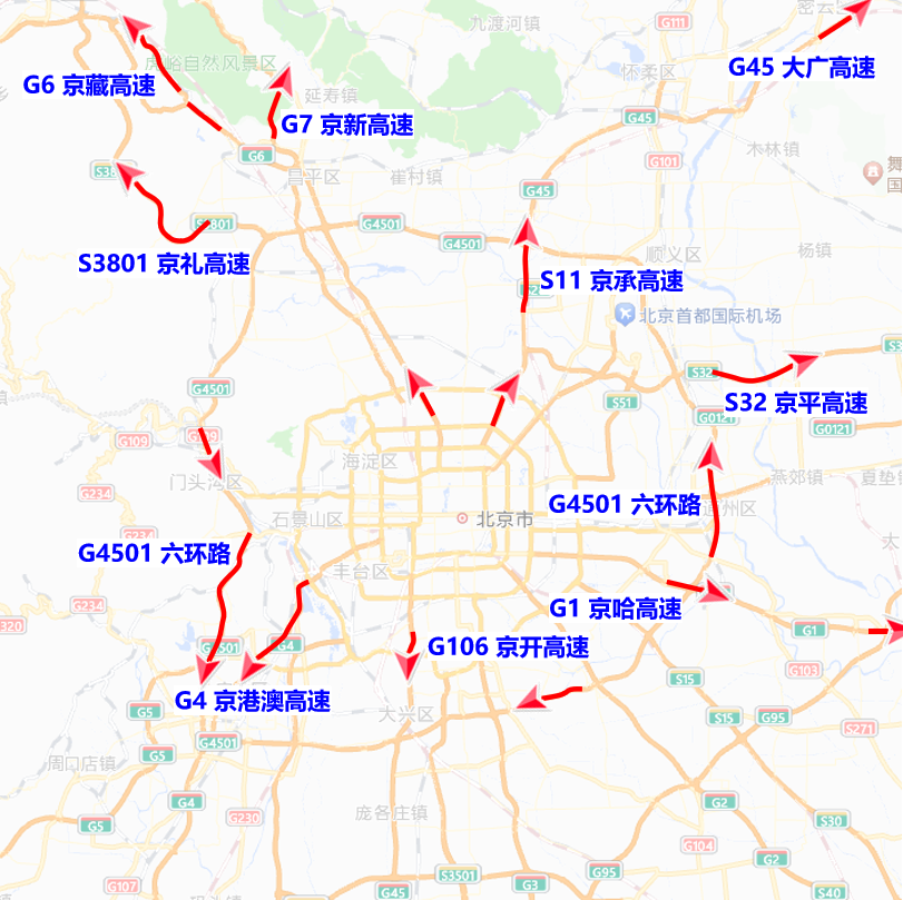 假期最后两日(10月6日、7日)迎来返程高峰,16时至20时高速公路进京方向交通压力将较为突出,京承、京藏、京礼、京港澳、京开、京沪、六环路等主要高速公路部分路段及琉璃河、康庄等部分进京检查站压力集中。