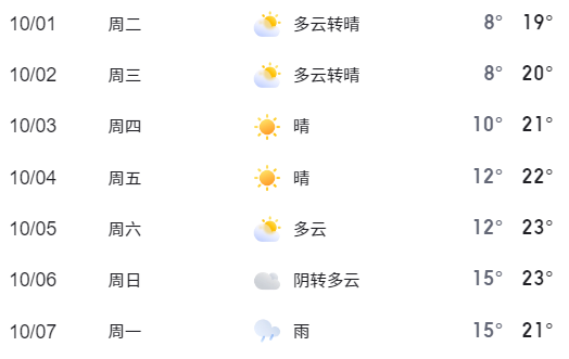 根据气象部门预报,国庆假期期间气温舒适,天气情况对交通出行无明显不利影响。出行前建议关注临近天气预报。